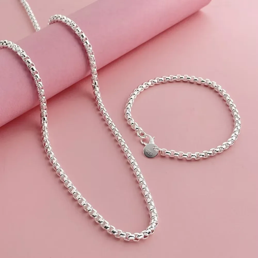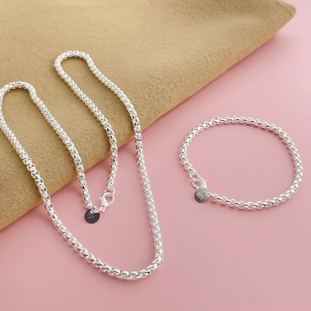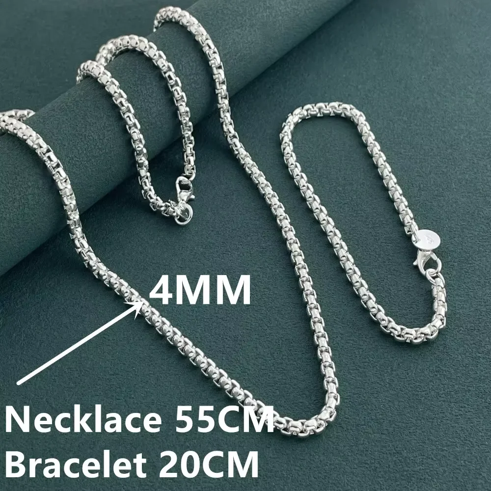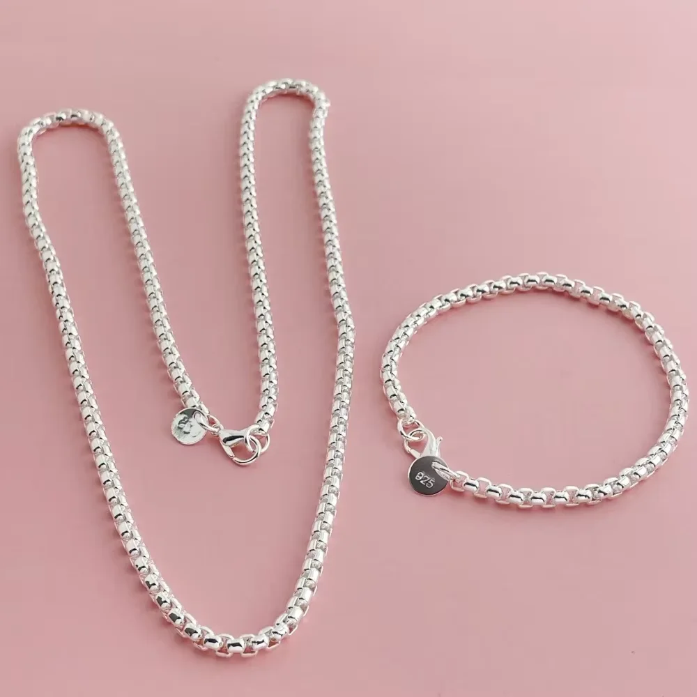 925 Sterling Silver 4mm Round Box Chain Venetian Bracelet Necklace Jewelry Set Daily Wear Fashion Accessories Men Women Jewelry