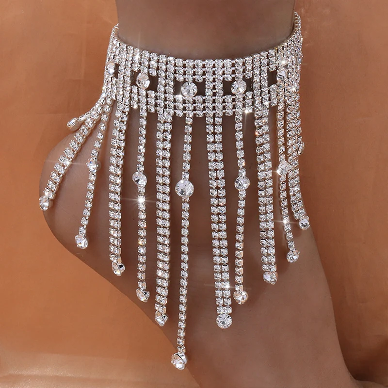 Stonefans Fashion Tassel Plaid Anklet Bracelet Jewelry for Women Crystal Hollow Out Mesh Foot Chain Ankle Cute Beach Accessories